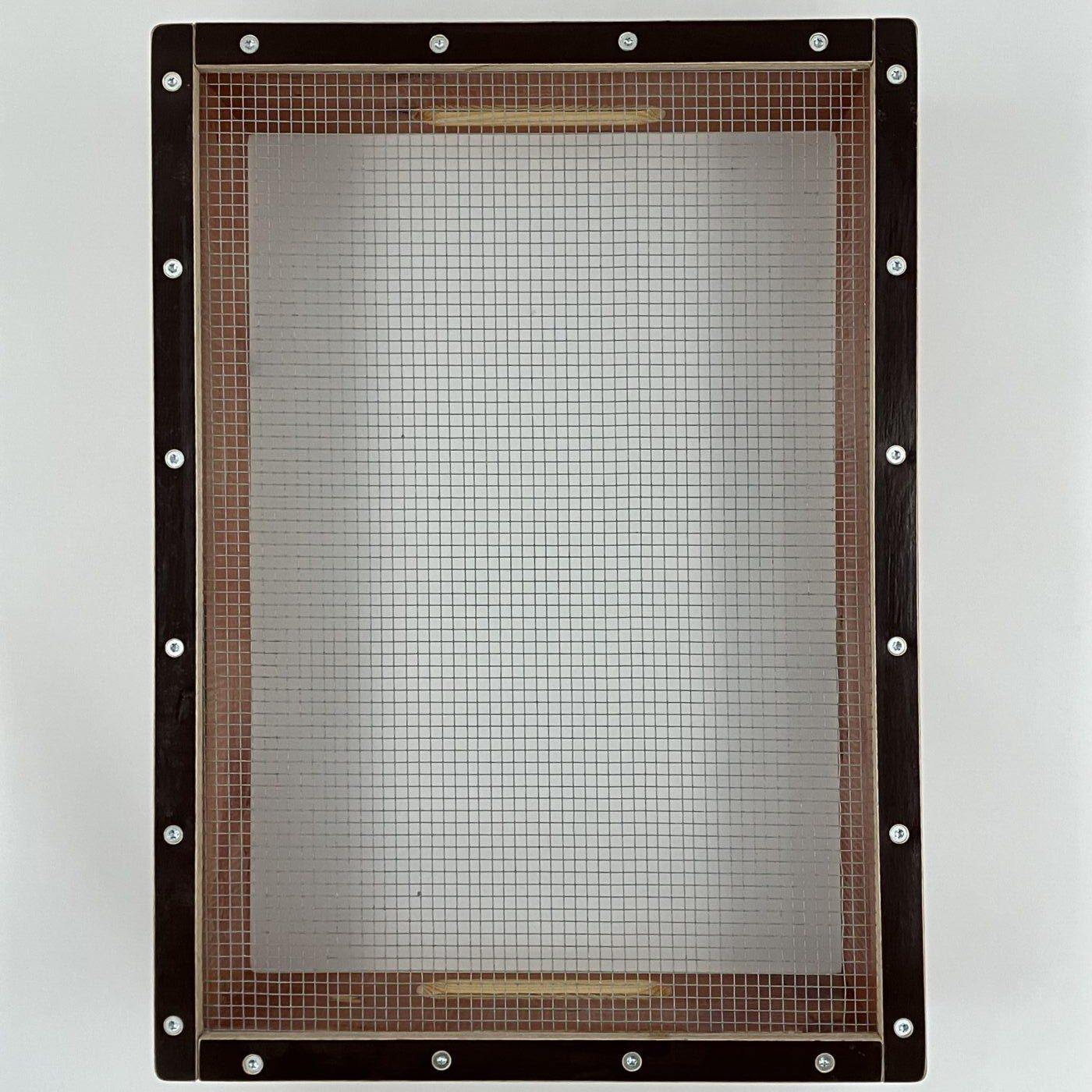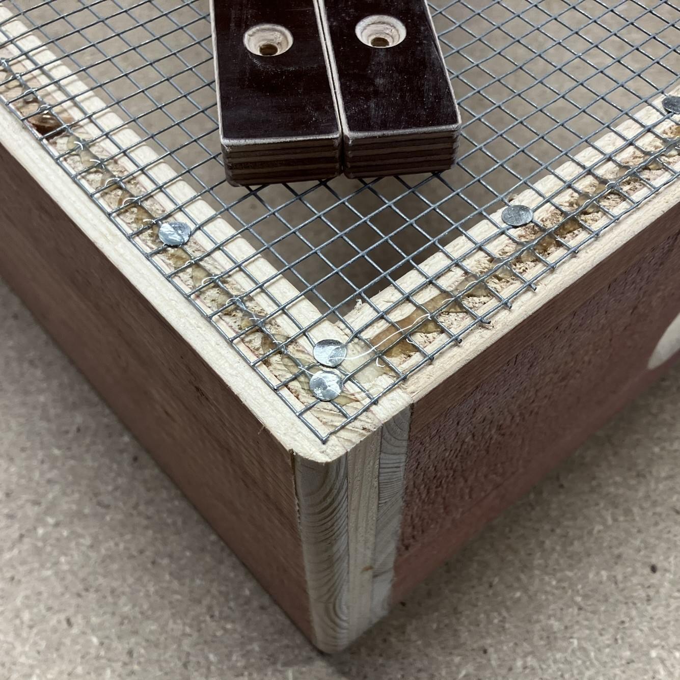 Das feinmaschige, rostgeschützte und verzinkte Drahtgitter wird mit ca. 50 Dachpappnägeln am Rahmen befestigt. Dadurch wird die benötigte Straffheit gewährleistet. Um die Befestigung abzurunden wird ein zusätzlicher Streifen aus einer Siebdruckleiste (14x23mm) mit Schrauben (4,5 x 60mm) an der Unterseite des Holzrahmens befestigt. Das Drahtgitter ist extra robust und wiederstandfähig.