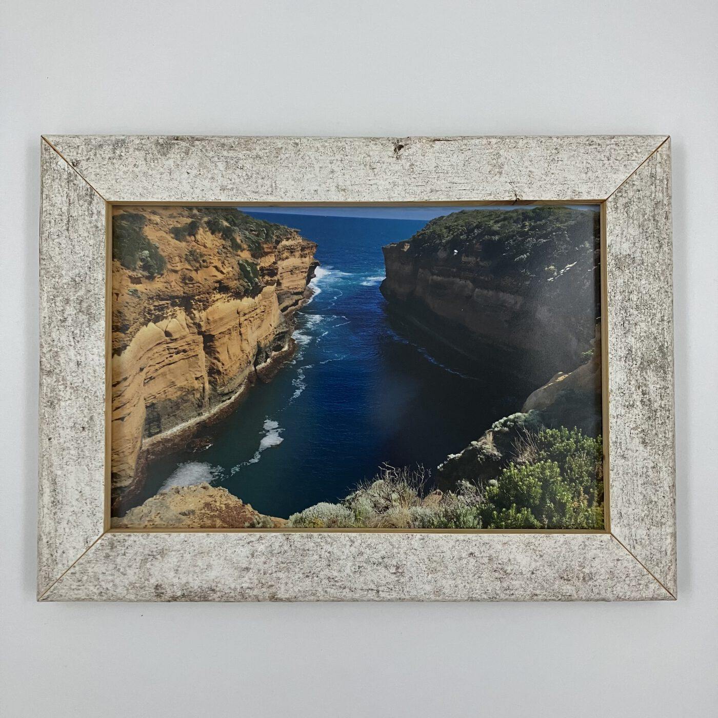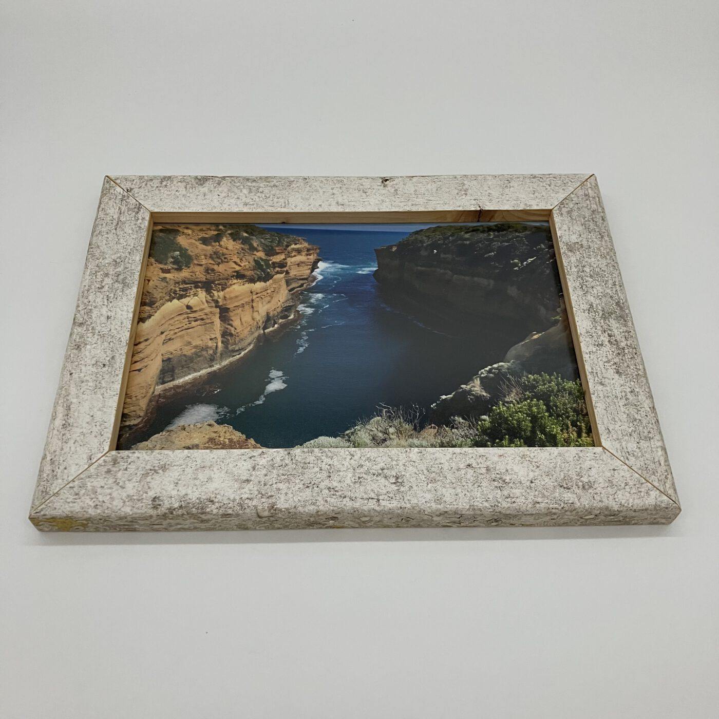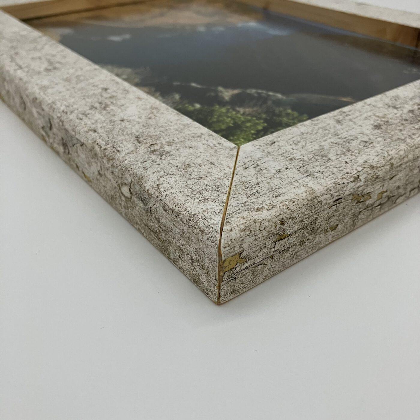 Die Bilderrahmenoberfläche wurde lediglich mit einem matten Klarlack behandelt, um die über die Jahre hinweg verwitterte Struktur und Farben noch besser darstellen und versiegeln zu können.