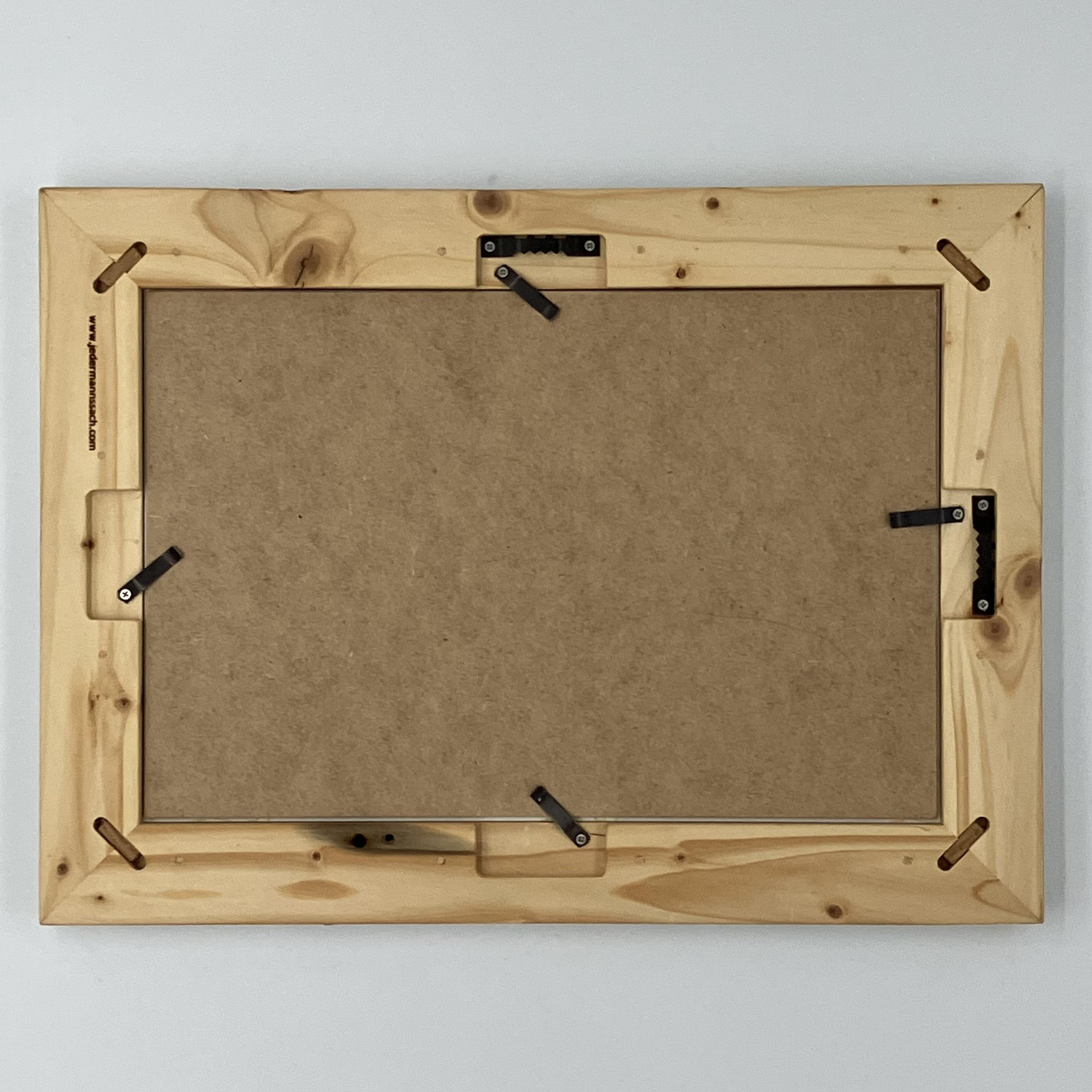 Die Rückwand aus mitteldichter Hartfaserplatte, auch MDF genannt, wird durch Wechselrahmenfedern aus Metall im Bilderrahmen gehalten. Durch diese Federn ist ein Bilderwechsel schnell möglich.