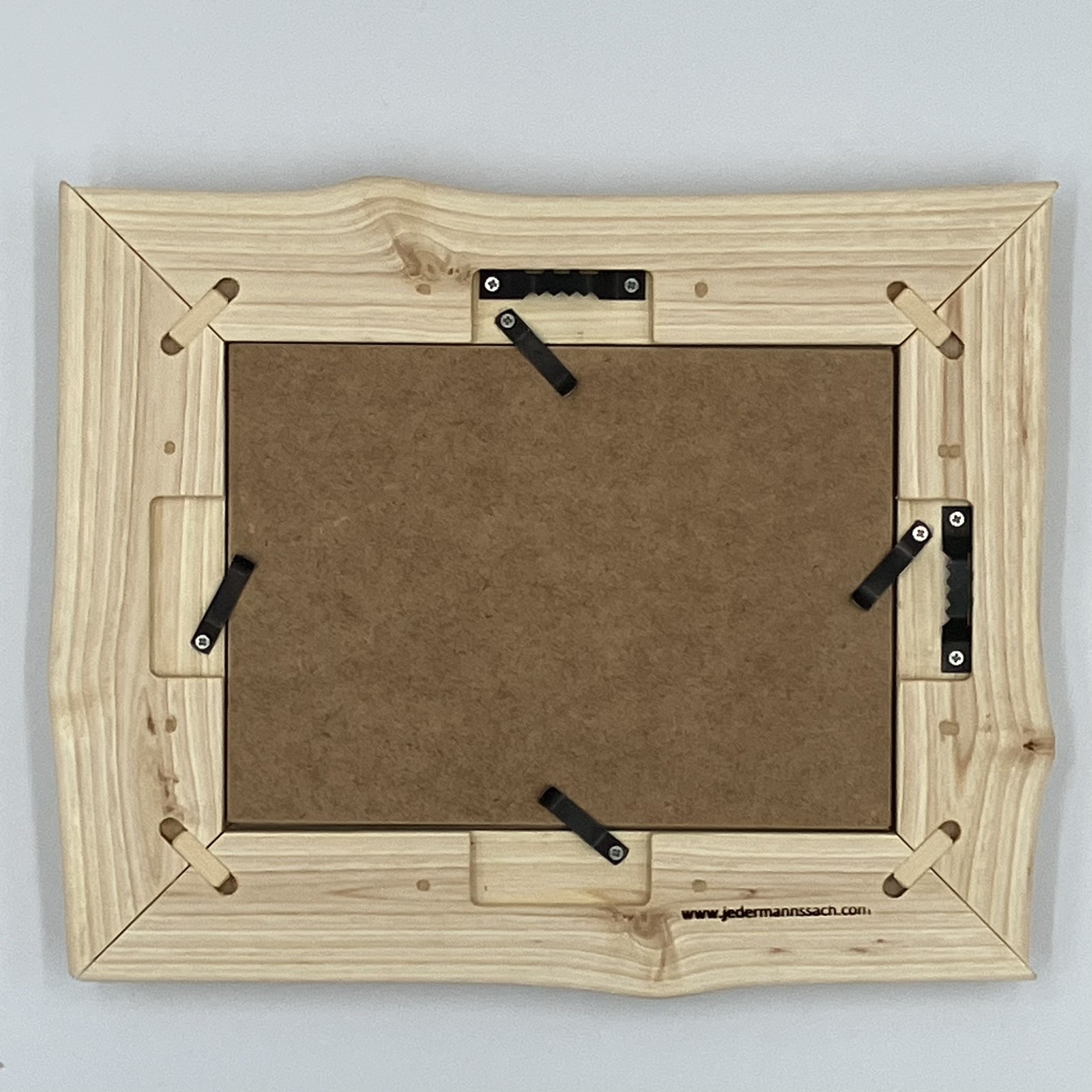 Die Rückwand aus mitteldichter Hartfaserplatte, auch MDF genannt, wird durch Wechselrahmenfedern aus Metall im Bilderrahmen gehalten. Durch diese Federn ist ein Bilderwechsel schnell möglich.